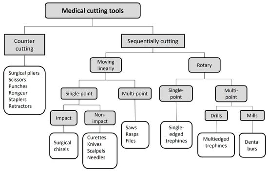 It is obvious that whatever object is being developed or studied, understanding its internal structure and properties helps to make the work more efficient. Due to this, the classification of medical cutting tools shall be developed in order to identify their key features and how they are inherited from a higher class of similar objects. Single-edge and multipoint tools with defined sharp blades, e.g., knives, saws, drills, and milling cutters, are used for different surgical procedures. Abrasive tools like abrasive bonds, abrasive heads, and disks can be considered as a subset of multipoint tools. They are also widely used in dentistry and in other medical applications. In addition, although piezoelectric surgery is not a common cutting technique for site preparation, it is sometimes used for maxillary sinus lifting procedures [43,44].