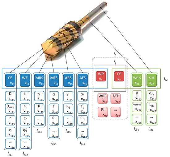In Figure 4, the edge l1 defines the main structural parts of the bur, which include the working part WP (vertex x1) and the clamping part CP (vertex x2). The working part is represented by the edge lx1 and consists of the cutting edge CE (vertex x11), the working edge WE (vertex x12), the main rake surface MRS (vertex x13), the major flank surface MFS (x14), the auxiliary rake surface ARS (vertex x15) and the auxiliary flank surface AFS (x14). Each of these elements has parameters described by edges lx11–lx15 containing the corresponding sets of vertices. Thus, the cutting edge CE is characterized by outer diameter D (vertex x111), core diameter Dcore (vertex x112), cutting edge rounding radius r (vertex x113), tip angle φ (vertex x114), and others (vertex x11n). The working edge WE has the total operational length L (vertex x121), edge rounding radius r1 (vertex x122), flute helix angle ω (vertex x123), cone angle φ1 (vertex x124), and others (vertex x12n). The main rake surface MRS has the following parameters: main rake angle γ (vertex x131), rake surface curvature radius R (vertex x132), and others (vertex x13n). The main flank surface MFS is described by main clearance (relief) angle α (vertex x141), margin width f (vertex x142), flank surface curvature radius Rf (vertex x143), and others (vertex x14n). The auxiliary rake surface ARS has a set of parameters, including auxiliary rake angle γ1 (vertex x151), a curvature radius of the auxiliary rake surface, R1 (vertex x152), and others (vertex x15n). The auxiliary flank surface AFS encompasses auxiliary clearance (relief) angle α1 (vertex x161), auxiliary margin width f1 (vertex x162), a curvature radius of auxiliary flank surface, Rf1 (vertex x163), and others (vertex x14n).