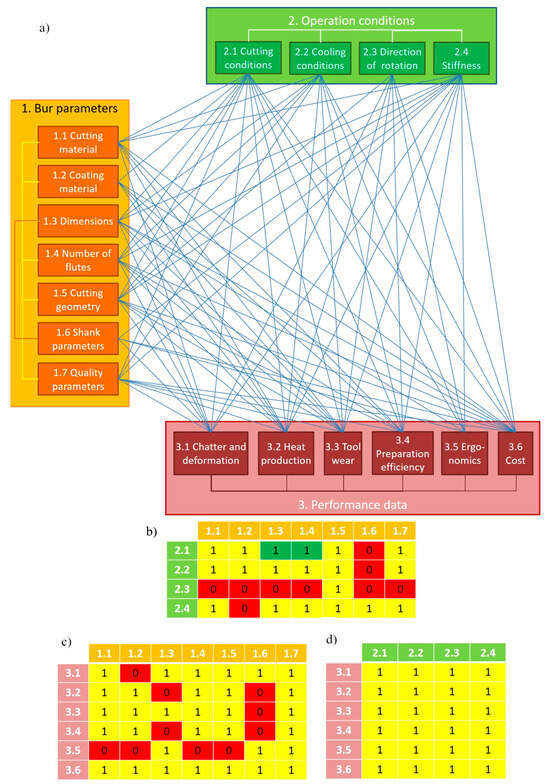 To create a database for the CAD system, this hypergraph can be represented as a set of three incidence matrices shown in Figure 6b,c. For better clarity, different colors were used to indicate the type of links (or their weight factors, if that is more convenient). The red color shows that there is no connection between parameters, or it can hardly be described. Yellow says that the connection is established empirically and cannot be described analytically, rather than, for example, by an equation with a series of correction factors. Green indicates that the relationship can be represented as an analytical expression. It is important to emphasize that the link types shown in Figure 6b,c were identified for the dental application, but for the metalworking industry, many of the same or similar connections may have a mathematical representation.