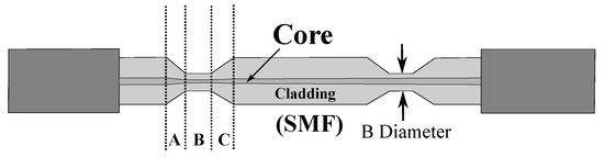 The device proposed for the experiments carried out through this research employs a configuration constructed using the tapered method, which consists of two sections with a separation of 10 mm between them and a specific waist diameter. The optical fiber used for this work was a single-mode SMF-28e (Corning, New York, USA) with core and cladding diameters of 8 m and 125 m, respectively. The tapers were produced using a Vytran® GPX 3400 glass processor and a Vytran V4 heating element. In this processor, the two taper shapes were made in the optical fiber. The transition sections in the structure are called the down taper (DT) and the up taper (UT), of 1 mm in length each, and the waist (WT) section, of 40 m in diameter, as can be seen in Figure 1. The presence of these taper sections in the optical fiber allows for increased attenuation. It is because of this that it is vitally important to secure these lengths between the two taper sections.
