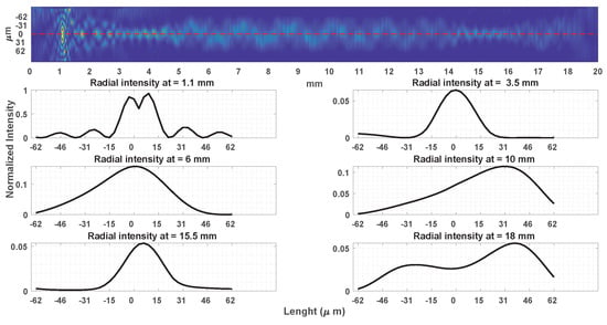 Figure 3 additionally shows the intensity profile of the radial distribution as a function of the z-axis of propagation. At z = 1.1 mm, the intensity is maximal, corresponding to the region where the electric field intersects the optical fiber. At z = 3.5 mm, it is discernible that propagation occurs solely in the fundamental mode, attributed to the dimensions of the beam waist. Subsequently, as propagation continues at z = 6 and 10 mm, the radial profile broadens, indicating propagation through the core and cladding without attenuation. Upon reaching the second concatenated waist, the fundamental mode persists, albeit with diminished intensity. The radial profile of the resultant spectrum is observed at z = 18 mm for a wavelength of 1559 nm.