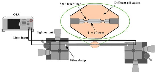 The MS9740A Anritsu optical spectrum analyzer model (OSA) was used to sense transmitted light and analyze its optical transmission characteristics [33]. The MZI sensor used in this study has high sensitivity to fiber torque and was, thus, fixed with two clamps at both ends. The sensor head was then immersed in a container of 20 mL solutions with different buffer pH 4, 7, and 10, all buffers belonging to the Analytyka company, and carefully prepared at an environment temperature of 24 °C.