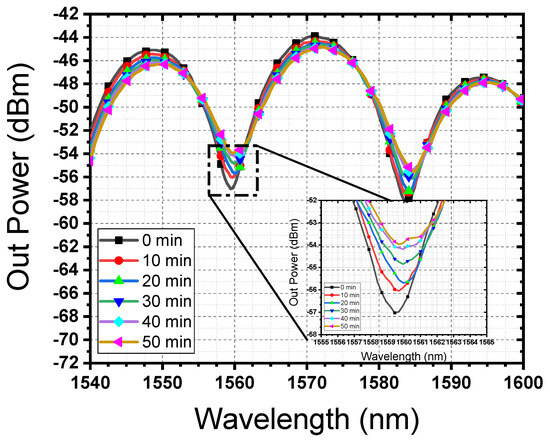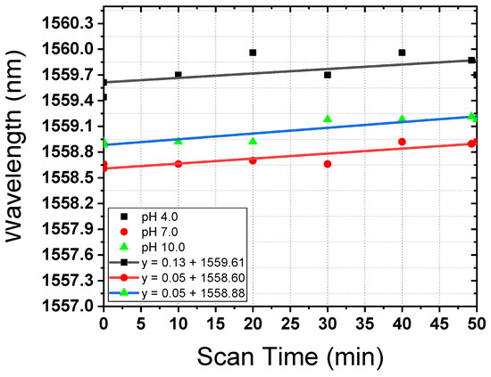 In order to investigate the response of the interference spectrum to changes in the refractive index (RI) for each buffer pH sample, the light source from OSA conducted interrogations on the samples for each pH for periods of 600 s. To confirm the precision and reliability of the measurements, five measurements were made in a total period of 3000 s. The spectral data acquired at each temporal interval are presented in Figure 6. It is evident that at the initial time point t = 0 s, the transmission spectrum exhibits a lower intensity compared to that at the final time point t = 3000 s. Furthermore, a gradual, near-linear shift in wavelength is discernible over the duration of the observation.
