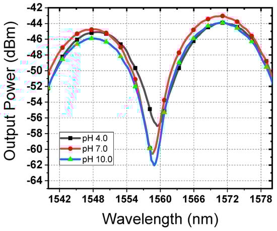 Figure 7 shows the bottom line fringe at 1559 nm, which was selected to observe the variations in the spectrum of different pH values. The spectrum of the sensor depends directly on the interaction between the core and cladding modes with the dissolved liquids surrounding it. The change in fringes is caused by the interaction of the fundamental and higher-order modes along the uniform waist, where they converge and change abruptly downwards and upwards. The spectral change between these modes will depend on the phase shift between their different effective refractive indices, mainly on the degree of interaction between the cladding mode and the refractive index of the surrounding solution.