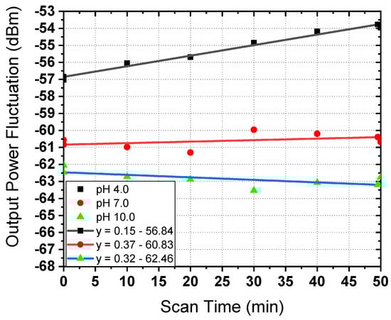 Output power shifting of the central response from the sensor when submerged in buffer pH values of 4 to 10 in a time of 0–50 min.