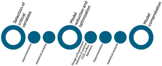 After identifying those factors that significantly affect the synthesis of NPs and their antimicrobial potential, the next step is the reduction (proper selection) of the original design. In this case, a new design will be created using either an I-optimal, CCD, or Box–Behnken on Design-Expert® software (version 22.0.2, Stat-Ease Inc., Minneapolis, MN, USA). This type of design is created with specialized statistical tools to optimize the response (either minimize or maximize it). Figure 1 presents a flowchart of the process.