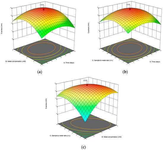 Surface response of S. aureus to the antimicrobial activity of AgNPs. (a) Interaction between the metal concentration and time; (b) interaction between the sample-to-metal ratio and time; (c) interaction between the sample-to-metal ratio and the metal concentration.