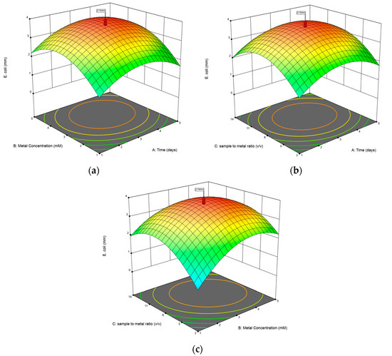Surface response of the antimicrobial activity of AgNPs toward E. coli. (a) Interaction between the metal concentration and time; (b) sample-to-metal ratio and time; (c) sample-to-metal ratio and metal concentration.