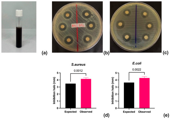 Confirmation of the antimicrobial activity of synthesized AgNPs. (a) Synthesized AgNPs; (b) inhibition halo for S. aureus; (c) inhibition halo for E. coli; (d) expected vs. observed analysis of the inhibition halo for S. aureus; (e) expected vs. observed analysis of the inhibition halo for E. coli.