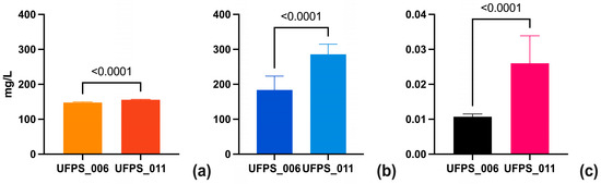 Macromolecules in the spent culture media of strains UFPS006 and UFPS011. (a) Total carbohydrates; (b) total proteins; (c) total lipids.