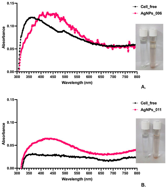 The UV-VIS spectra recorded for silver nanoparticle (AgNP) extracts corresponding to the UFPS006 and UFPS011 strains showed characteristic absorption peaks at 427 nm and 438 nm, respectively, as illustrated in Figure 6. These values confirm the formation of spherical silver nanoparticles, as these wavelengths fall within the typical range for surface plasmon resonance (400–450 nm) associated with spherical metallic nanoparticles [18,19,23]. The differences in absorption peaks between strains likely reflect variations in the size and morphology of the synthesized nanoparticles, which may be attributed to biochemical differences in the exopolysaccharides (EPS) secreted by each strain. These biomolecules, containing functional groups such as hydroxyl, amine, and carboxyl groups, interact with silver ions during synthesis, modulating both nanoparticle growth and stability.