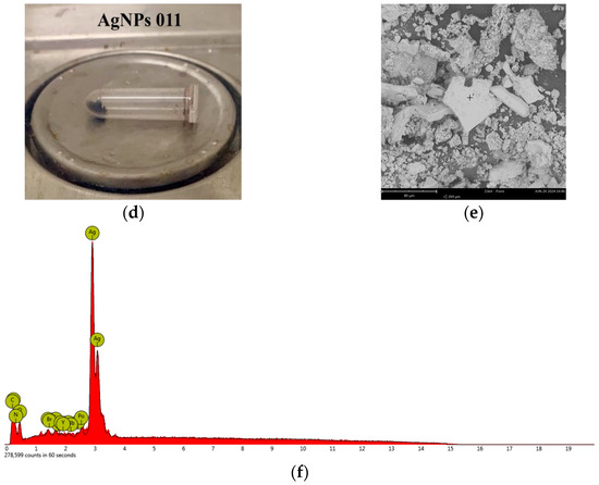 SEM and EDX characterization of AgNP006; and AgNP011. (a) Macroscopic image, (b) SEM, and (c) EDX analysis of AgNP006, (d) Macroscopic image, (e), SEM, and (f) EDX analysis of AgNP011.