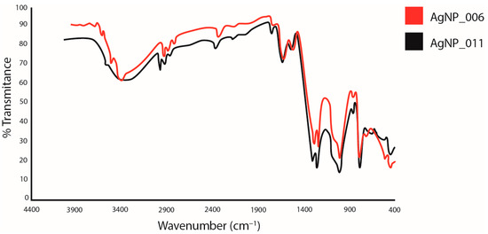 The UV–VIS spectra of the AgNP extracts were recorded with a Spectroquant Pharo 300 UV/VIS spectrophotometer (Figure 6) in the wavelength range from 200 to 800 nm. Initially, the formation of AgNPs could be detected with the naked eye by changing color from translucent to dark pink. The highest absorbance was obtained at a wavelength of 427 nm for AgNP006 and 438 nm for AgNP011 (Figure 6), indicating the formation of AgNPs. The wavelengths between 400 and 450 nm are the typical range of maximum wavelengths for AgNPs and can be attributed to spherical NPs [23].