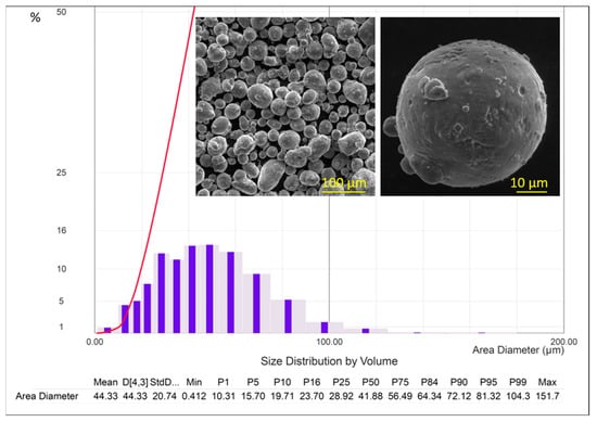 To confirm the particle size and elemental composition, the powder was also analyzed using a Tescan Vega 3 LMH scanning electron microscope (Tescan, Brno, Czech Republic) equipped with an energy-dispersive analysis (EDX) X-Act module (Oxford Instruments, Abington, UK). The circularity factor of the powder was found to be 0.682, which is sufficient for the stable application of a uniform and homogeneous layer. The spherical shape of the particles allows for more compact and tight packing within a given volume, ensuring the flowability of the powder composition in material feed systems with minimal resistance. The elemental composition of the powder meets the declared specifications (Table 1).