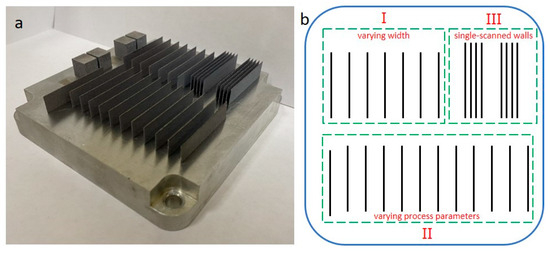 In the present study, the dependence of the quality of manufactured thin-walled elements on wall thickness was investigated, as well as the influence of SLM parameters on the quality of the produced samples. Additionally, the possibility of achieving a high-quality minimum wall thickness through single-pass laser scanning was explored. Furthermore, Figure 2 illustrates the configuration of the printing platform for the AlSi10Mg objects used in the investigation. A total of six such platforms were printed.