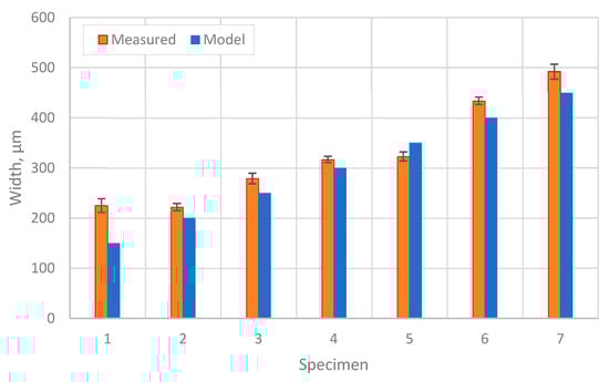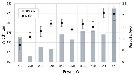 With an increase in power, the average wall thickness also increases. This is consistent with the theoretical conclusions made in previous studies that simulated the melt pool geometry as a function of power. As the size of the melt bath increases, the size of a single bead grows; hence, the thickness of a built wall increases as well [34,35]. In addition, following the findings in [34], at higher values, laser scanning velocity affects the melt pool size less than laser power. At 200 W, it was not possible to grow a continuous wall, and at 230 W, the wall remained unstable along its entire length. The smallest thickness with stable formation was achieved in the power range of 260–350 W, with the wall thickness in the 320–350 W range showing the least deviation from the average value (Figure 7).