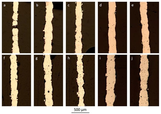 Cross-sections of single-pass walls obtained at scanning speed of 1500 mm/s and laser power of 230 W (a), 260 W (b), 290 W (c), 320 W (d), 340 W (e), 350 W (f), 380 W (g), 410 W (h), 440 W (i), and 470 W (j).