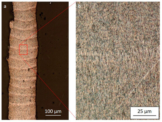 Figure 6 presents cross-sections of the walls, clearly indicating that the thinnest wall is obtained at a laser power of 200 W and a scanning speed of 1500 mm/s (Figure 6a). However, this configuration shows a noticeable lack of fusion evidenced by the periodic interruption of the wall. The most favorable process parameters can be considered as follows: P = 230 W and V = 1500 mm/s.
