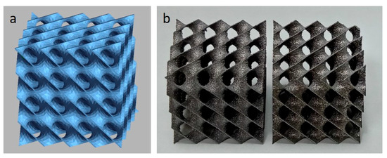 Model (a) and manufactured Diamond cellular structures with cell size of 5 × 5 × 5 mm (b).