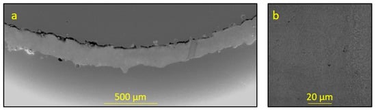 A cross-section of a thin-walled element of the Diamond lattice structure at ×140 (a) and ×5000 (b).