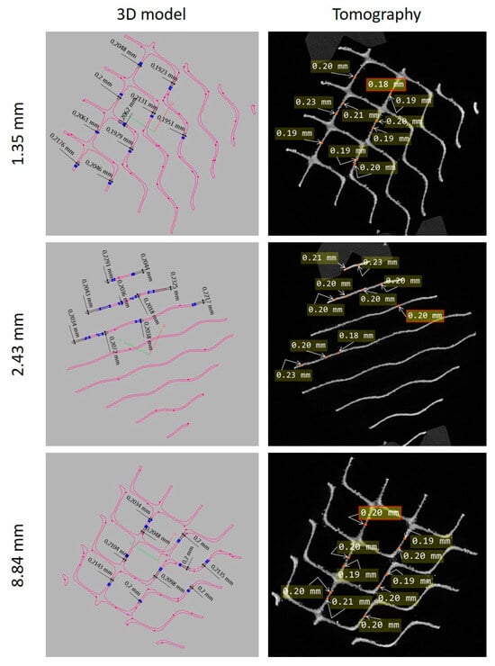 The study of the geometric accuracy of the manufactured structures was conducted using computer tomography at several sections located at 1.35 mm, 2.43 mm, and 8.84 mm from the surface and comparing them with the digital model (Figure 11). In these sections, the contour of the lattice structure is maximally straightened, forming straight lines for ease of measurement.