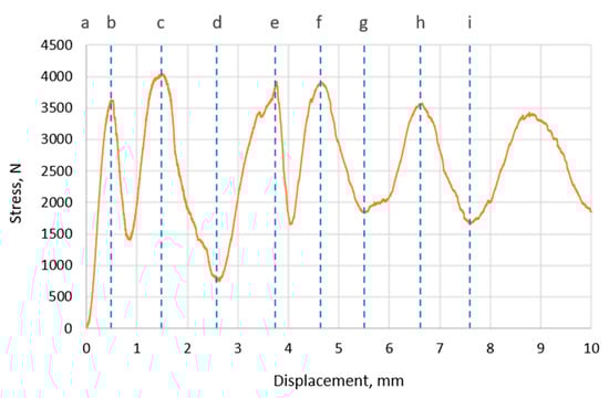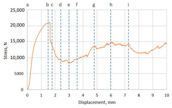 A compression stress–displacement curve of a Diamond cellular structure with a wall thickness of 0.6 mm. Letters refer to the state of a specimen in Figure 17.