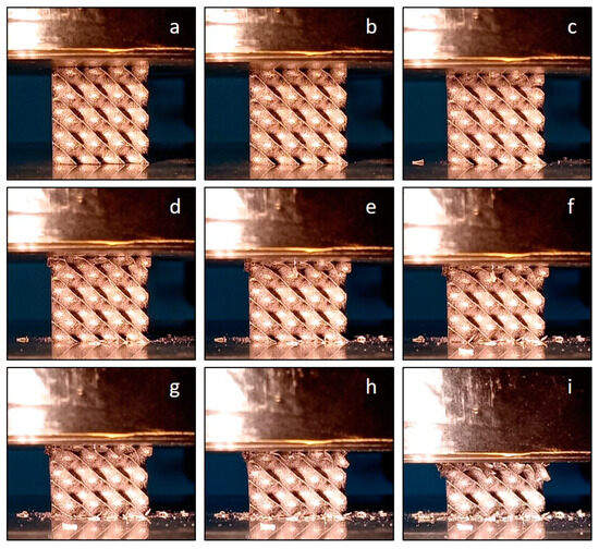 Images of the Diamond cellular structure with a wall thickness of 0.6 mm during mechanical testing: the state of the specimen at the beginning of the test (a) and the state of the specimen at a certain point on the stress–displacement curve Figure 16 (b–i).