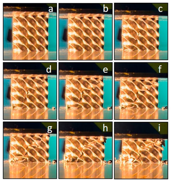 Images of the Diamond cellular structure with a wall thickness of 0.4 mm during mechanical testing: the state of the specimen at the beginning of the test (a) and the state of the specimen at a certain point on the stress–displacement curve Figure 14 (b–i).