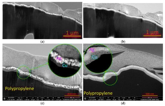 The study of the structure of polypropylene mesh samples with (Ag,Cu) coatings formed in different environments, Ar (sample N1) (Figure 3a,c), and N2 (sample N4) (Figure 3b,d), shows significant differences. In sample N1, the Ag layer has a clearly defined granular structure with a grain size of 20–60 nm (Figure 3c), while in sample N4, the granular structure is poorly distinguishable (Figure 3d). There are also differences in the structure of the copper layer. In sample N1, the Cu layer is dense, without noticeable defects, while in sample N4, the copper layer has a structure similar to a spongy one, with dark-contrasting inclusions (pores) measuring 10–30 nm (Figure 3d).