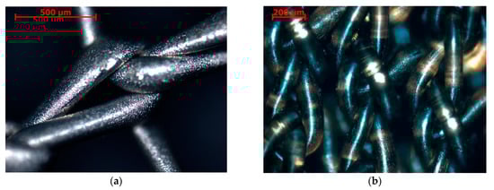 In addition, overheating the sample leads to not only its deformation (the distortion of the weave) but also the melting of the thread material (the formation of droplets of melted thread material; Figure 6). Thus, a pulsating treatment was employed to prevent the overheating of the sample during the formation of the metal coating. The coating application time (30 s) was divided into three 10 s cycles (with 10 s breaks between sputtering).