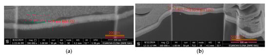 The coating thickness was determined according to the deposition time. The coating thickness of the Ag-coated samples (N2 and N3) is 85 ± 13 nm (Figure 7a), and that of the (Ag,Cu)-coated samples (N1, N4, and N5) is 159 ± 28 nm (Figure 7b); the layer thickness is approximately the same, and it is comparable with the thickness of a single-layer coating of 80 ± 8 nm.