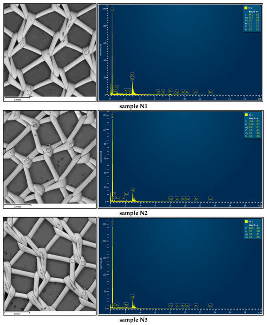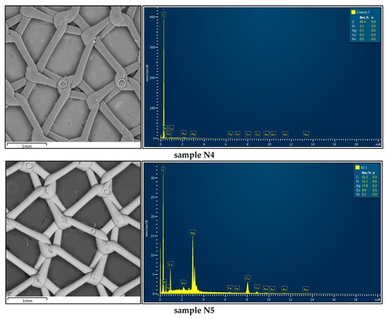 Table 3 presents the elemental composition of the coatings applied to the mesh samples using different methods. The location of the points (spectra) for determining the elemental compositions is shown in Figure 8. The various methods for forming the coatings on samples N1–N5 have been previously presented in Table 2. The Ag content in the coating composition is in obvious correlation with the thickness of the Ag layer in the coatings. The greater the thickness of the Ag layer, the higher the content of this element.