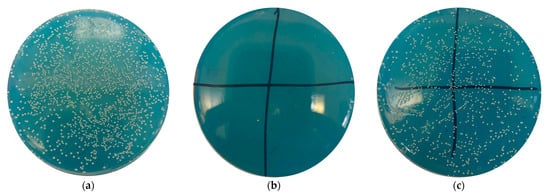 Despite controversy over the most significant pathogens leading to infection, staphylococcal species are generally considered the most pathogenic [13,66,67,68]. Notably, in 81% of cases, the causative agent is bacteria of the genus Staphylococcus, involving MRSA in 52% of cases [67]. Therefore, we used a museum strain of Staphylococcus aureus (American Type Culture Collection: ATCC 6538) [69], a physiological solution, and a turbidity standard of 0.5 McFarland units [70] to prepare a microbial suspension, which was brought to a concentration of 8 × 104 colony-forming units (CFU) in a total volume of 1 mL using serial dilutions. Subsequently, 0.2 mL of the resulting suspension was plated on Mueller–Hinton agar (an internationally recognized medium for determining antibacterial activity) in a control dish to determine the initial concentration and later make comparisons with the experimental dishes. Each sample was placed in a vial with a microbial suspension of 8 × 104 CFU (1 mL) and shaken in a shaker for 30 min. Thereafter, 0.2 mL of each vial mixture was seeded onto a Petri dish and placed in a thermostat for 18–24 h, after which the number of formed colonies was counted. The resulting number was multiplied by 5 to calculate the CFU in 1 mL and compared with the control. The reduction in microbial contamination was estimated as a percentage of the initial microbial load.