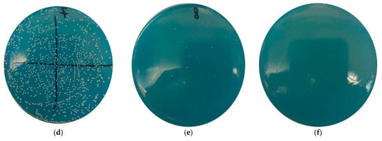 Antibacterial activity of Ag-containing coatings, showing views of the Petri dish after seeding (18–24 h) the microbial suspension (control sample) and mixtures of the microbial suspension and test samples previously shaken for 30 min (experimental samples): (a) control, (b) N1, (c) N2, (d) N3, (e) N4, and (f) N5.