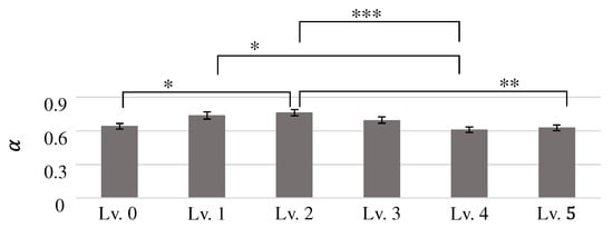 As shown in Table 1, the values of were , , , , , and for the object density levels of 0 to 5, respectively. All of these values are significantly smaller than one. Figure 2 shows bar figures of the values and the results of the statistical comparison. Significant differences were found between several pairs of object density levels: levels 0 and 2 (, ), levels 1 and 4 (, ), levels 2 and 4 (, ), and levels 2 and 5 (, ). At object density level 2, the perceived speed was closest to linearity, as the value was nearer to 1 compared to those for the other object density conditions. The values for levels 4 and 5 were smaller than that for level 2 and close to the value for level 0, suggesting that the linearity of speed perception became low at high object density levels.