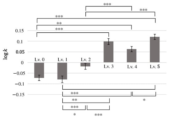 Further, as shown in Table 2, the values of k were , , , , , and for object density levels of 0 to 5, respectively. The values of k at levels 0 and 1 were significantly smaller than 1, and those at levels 3 to 5 were significantly greater than 1. Figure 3 shows the result of the t-tests about , a parameter describing the magnitude of perceived speed. Significant differences were found between several pairs of object density levels: levels 0 and 3 (, ), levels 0 and 4 (, ), levels 0 and 5 (, ), levels 1 and 2 (, ), levels 1 and 3 (, ), levels 1 and 4 (, ), levels 1 and 5 (, ), levels 2 and 3 (, ), levels 2 and 4 (, ), levels 2 and 5 (, ), and levels 4 and 5 (, ). As a general trend, the k values increased as the density level increased.