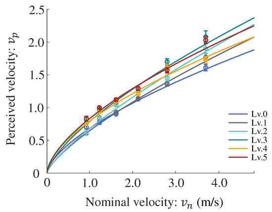 Figure 4 presents the mean perceived velocities along with the standard errors among the participants, as well as the approximated functions of Stevens’ power law for different object density levels. The coefficients of determination () were 0.726, 0.691, 0.762, 0.704, 0.711, and 0.721 for density levels 0–5, respectively. While visually assessing the linearity of these curves is challenging, the differences in the perceived magnitudes across the density levels are evident. Specifically, the magnitudes for level 0 (blue) and level 1 (gray) are relatively lower compared to those of the other curves, whereas those for level 3 (green) and level 5 (red) are noticeably higher. These vertical placements of the curves correspond to the values presented in Table 2 and Figure 3.