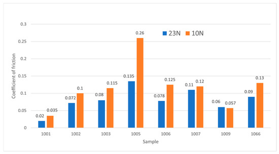 As can be seen in Figure 3, a decrease in the coefficient of friction with increasing load can be considered a general pattern for coatings sprayed on the AISI 430 substrate (group 1). The reduction in COF for samples 1001, 1002, 1003, 1005, 1006, and 1066 ranged from 28 to 48%. On the other hand, samples 1007 and 1009 showed a slight difference in the COF. Among the samples in group 1, the coating of sample 1001, which contains titanate, MoS2, and graphite (as binder, solid lubricant, and additive, respectively) showed the lowest coefficient of friction at 150 °C. In the same way, the decrease in the COF can be considered a general pattern for coatings sprayed on the Inconel 750-X substrate when the load increases from 10 to 23 N (Figure 4).
