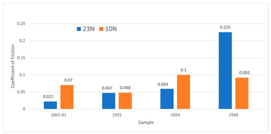 The tendency to decrease the coefficient of friction with an increase in the contact load can be observed in the other samples at 150 °C (Figure 3 and Figure 4), except for sample 2560, and these are inconsistent with the data from the work by Tillmann et al. [8], who also noted a minimum coefficient of friction in the temperature range of 300–375 °C.