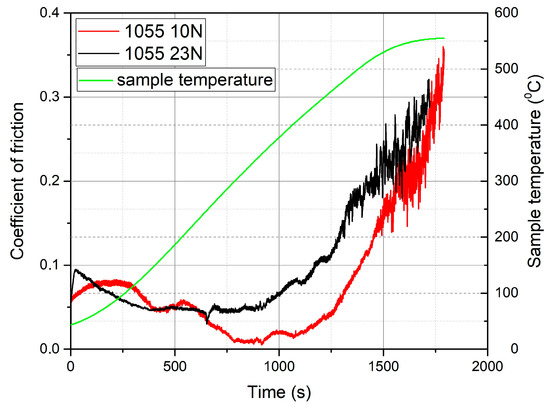 Figure 7 shows the behavior of COF over time for sample 1055 at loads of 10 N and 23 N. Here, it can be seen that this sample under a load of 10 N can provide a COF below 0.1 up to temperatures of 500 °C, while this level of COF under a load of 23 N can be provided up to temperatures close to 430 °C. This figure clearly shows that the coefficient of friction of graphite-based coatings gradually increases as they lose their antifriction properties due to their failure (see the curve behavior change after 1350 s and 1500 s for the black and red curves, respectively). This observation is contrary to the behavior of the COF of molybdenum disulfide, which increases sharply when it loses its lubricating properties (see in Figure 5 the curve change after 1000 s and 1250 for the red and black curves, respectively).