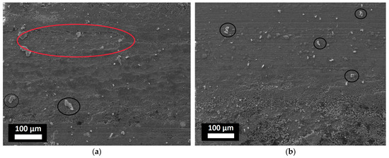 Figure 8 shows the SEM images of the coating surfaces of sample 1055 after testing under 10 N and 23 N. From Figure 8a, it is possible to conclude that during testing under 10 N, large coating particles peel off. The place where this peeling occurs is shown in Figure 8a and is highlighted in red. In addition, in this figure, one can see how small particles of the coating (highlighted in black) that peeled off during the friction process are found on the friction track.