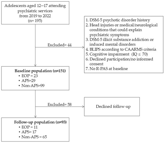 Study population flowchart [authors’ own processing]. APS: Attenuated Psychotic Symptoms; BLIPS: Brief Limited Intermittent Psychotic Symptoms; CAARMS: Comprehensive Assessment of At-Risk Mental State; EOP: Early-Onset Psychosis; R-PAS: Rorschach Performance Assessment System.
