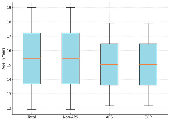 The final study population comprised 151 adolescents divided into three subgroups: (i) 23 EOP adolescents, (ii) 29 DSM-5 APS adolescents, and (iii) 99 non-APS adolescents. The means and SDs of age are shown in Figure 2.