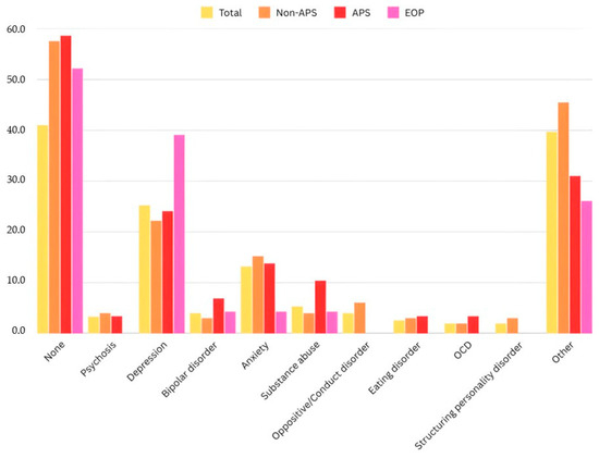 Family history of psychiatric disorders across all groups (%) [authors’ own processing]. EOP: Early-Onset Psychosis, APS: Attenuated Psychotic Symptoms.