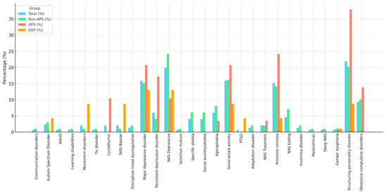 Distributions of DSM-5 diagnoses by group at baseline (%) [authors’ own processing]. EOP: Early-Onset Psychosis, APS: Attenuated Psychotic Symptoms.