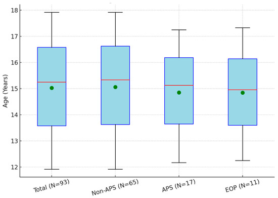 Age distributions in all groups at follow-up. The orange lines represent the medians, and the green dots represent the means [authors’ own processing]. EOP: Early-Onset Psychosis, APS: Attenuated Psychotic Symptoms.
