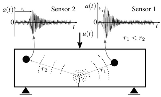 - Signal onset time: The time of the first reading beyond the detection limit: 49 dB (280 μV). The amplitude threshold was chosen based on previous experiences in the use of the sensor and acquisition system. In other applications carried out by the research team with the same AE system, the same threshold was used, see for example [34].