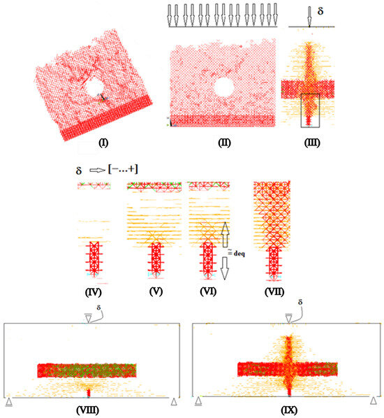 - Tanzi, B.N.R.; Birck, G.; Sobczyk, M.; Iturrioz, I.; Lacidogna, G. Truss-like Discrete Element Method Applied to Damage Process Simulation in Quasi-Brittle Materials. Appl. Sci. 2023, 13, 5119. [Google Scholar] [CrossRef]