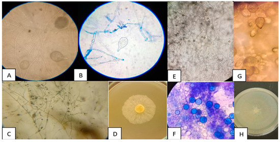 Macroscopic and microscopic morphology of two Phytophthora spp. isolates obtained from bell peppers, identified as Phy1 and Phy2. Phy1: (A,B) ovoid sporangia, (C) coenocytic hyphae without transverse septa, and (D) colony morphology on V8 medium; Phy2: (E) coenocytic hyphae without transverse septa, (G) ovoid sporangia, (F) chlamydospores, and (H) colony morphology on V8 medium.