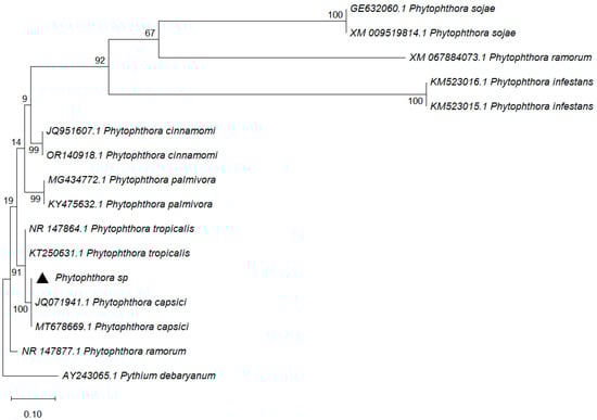 A phylogenetic analysis was performed with MEGA 12 software (MEGA Software, Tempe, AZ, USA) [29]. To generate the phylogenetic tree, the ITS sequence obtained was aligned with other species available from NCBI. The sequences were selected by means of a search for nucleotide sequences homologous to the obtained ITS sequence. The sequences were aligned with MUSCLE [30] using the Gblocks programme [31] within the Phylogeny.fr platform [32]. Segments with variable positions or gaps were discarded, and only the conserved blocks of the multiple alignment were kept. With the curated sequences, the best-fit DNA evolutionary model was identified using MEGA 7.0.21 [29]. A phylogenetic analysis of Phytophthora spp. was performed. For this, the maximum parsimony (MP) criterion was applied by means of the Kimura-2 parameter model [33] and Gama distribution using 10,000 replicates (Bootstrap).